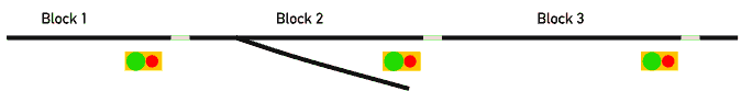 Das Prinzip der BlocksteuerungDer blaue Zug passiert nacheinander die Blocksignale. Der graue Bereich ist der Meldebereich. Dort wird automatisch erfasst, dass ein Zug vorbei kommt. Zu Beginn sind alle Signale und damit Blöcke auf grün gestellt. Der Zug zieht sozusagen das rote Signal hinter sich her. Im Modell muss der Meldebereich mindestens eine Zuglänge hinter dem Signal stehen, denn normalerweise sind die Blockabschnitte nur wenig länger als der längste Zug. So kann es nicht passieren, dass ein langer, schwerfälliger Zug, der lange zum Anfahren braucht und den Block entsprechend langsam räumt, mit den letzten Wagen in den von der Lok schon frei geschalteten Block hineinragt. Wenn der nachfolgende Zug dann möglicherweise ein flinker Schnelltriebwagen ist, dann zahlt sich der Sicherheitsabstand schnell aus. Ich musste aus diesem Grund die Meldeabschnitte komplett verlagern. Blocksteuerung mit Verzweigung oder RangierbetriebInnerhalb eines Blockes kann auch eine Verzweigung sein, es können sogar vollkommen unabhängige Zugbewegungen ablaufen. Da der Block nicht wieder freigegeben wurde, darf kein nachfolgender Zug in den Block einfahren.