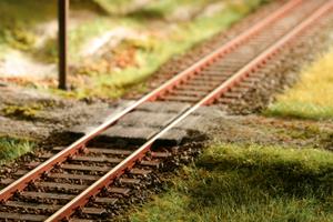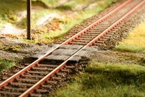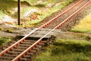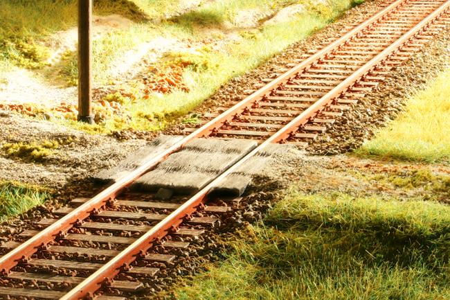Eine eingleisige Strecke und ein schmaler Feldweg, macht zusammen einen simplen Bahnübergang. Wer hätte gedacht, dass die Aufnahme in einem Keller entstanden ist?