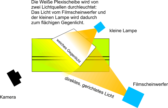 Das LichtDas Licht kommt für das Arrangement kommt aus einem 1000 Watt Stufenlinsenscheinwerfer, wie er beim Film und im Fotostudio verwendet wird. Ein Teil fällt direkt auf das Motiv, ein Teil wird über eine weiße Plexiglasscheibe, die im Gegenlicht schräg über dem Arrangement hängt, geleitet. Zusätzlich ist hinter dieser Plexischeibe noch eine weitere Lichtquelle. So gibt es eine harmonische Mischung: Direktes Streiflicht für Highlights, Farben und Tiefe einerseits und dazu weiches Gegenlicht für die Schatten und optimalen Kontrast andererseits. Das Licht kommt wie auch draußen in der Natur aus einer Richtung, eine künstlich wirkende Aufhellung aus der Gegenrichtung ist hier nicht nötig.
