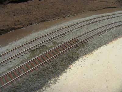 Man muss es leider sagen: Die meisten von den großen Zubehörlieferanten erhältlichen Schotter sehen grauenvoll aus. Meist wird Quarzsand verwendet, der erstens zu groß ist und ausserdem rund und zudem glänzend. Ich verwende maßstäblich klein gebrochenen Schotter der Firma Jeweha in Belgien. Preiswert und große Auswahl an Gesteinsarten und Massstäben. Damit sieht selbst das ansonsten grobe Roco Gleis wie auf der Abbildung ganz unten annehmbar aus. Der Schotter wird mit einem Teelöffel vorsichtig verteilt und mit einem weichen, kurzen Borstenpinsel so zurechtgebürstet, dass er sauber zwischen, nicht auf den Schwellen liegt und seitlich gerade und gleichmäßig abschliesst.