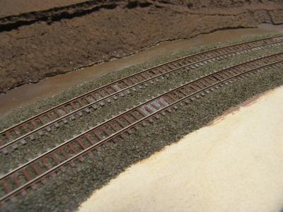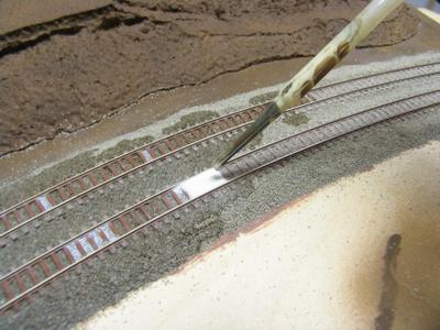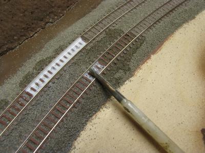 Man kann die noch feuchte Farbe oben auf den Schienen mit einem Lappen leicht wieder entfernen. Ich lasse die Farbe meist trocknen und entferne sie erst am Schluss, nach dem Schottern. Beim Schottern gelangt nämlich auch Kleber auf die Schienenoberseite, den man dann wieder entfernen muss. Wenn alles getrocknet ist, kann man Farbe und Kleber gleichzeitig mit einem Hölzchen wieder abkratzen. Dabei werden die Schienen nicht verkratzt und mit der Farbe zusammen geht der Kleber leichter wieder ab. Alternativ kann man natürlich auch den Kleber mit einem feuchten Tuch sofort nach dem Auftragen wieder abwischen. Gleise einschottern