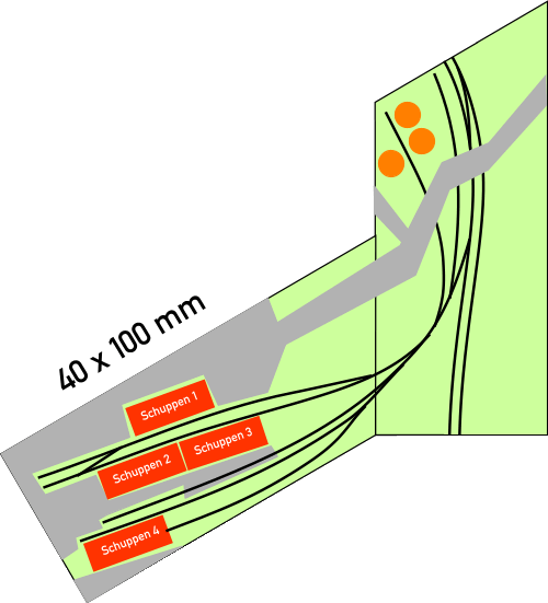 Der Trick ist wieder eine abgeschrägte Ecke, die es ermöglicht, dass die Hauptstrecke (im senkrecht abgebildeten Modul) einen kleinen Schlenker macht. Ein Gleiswechsel und der eigentliche Abzweig ermöglichen den Zugverkehr in beide Richtungen. Über einen Gleiswechsel und eine abzweigende Weiche gelangt man zu den insgesamt fünf plus zwei Rangiergleisen. Die Rangiergleise können nach Belieben zu mehreren Schuppen oder auch Rampen führen. Es gibt ein langes Ausziehgleis, das es ermöglicht, längere Züge zu zerlegen und die einzelnen Wagen den Verladestellen zuzustellen. Es verläuft leicht gebogen parallel zur Hauptstrecke. Zusätzlich gibt es ein weiteres Verladegleis parallel zum Ausziehleis, in dem Beispiel als Tanklager mit Kesselwagen Abfüllung. Wichtig ist, dass in den fünf Rangiergleisen mindestens ein Gleiswechsel eingebaut ist; ein Gleis bleibt frei, damit die Lokomotive umsetzen kann und die Wagen sowohl auf das Gleis für die Kesselwagen schieben kann als auch die Möglichkeit erhält, einen fertig be- oder entladenen Zug wieder auf die Strecke zu ziehen. Die Strasse kann man nach Belieben über eine Brücke führen oder einen Bahnübergang über vier Gleise planen. Für eine sanfte Brückenauffahrt ist genug Platz. Der Vorschlag ist absichtlich etwas asymmetrisch gehalten, damit auf dem Vorplatz der Ladehallen jede Menge LKW Verkehr dargestellt werden kann. |