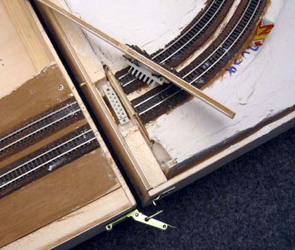 Da die Schienen nicht bis an den Rand der Kisten heranführen, muss ein Übergangsstück her. Das muss mechanisch sauber verbunden werden, sonst hüpfen die Züge aus dem Gleis. Damit kein stromloser Abschnitt entsteht, muss das kurze Zwischenstück auch mit Fahrstrom versorgt werden. Die Lösung bestand in einem stabilen Stecker, der unten an das schmale Sperrholzstück geklebt wurde. Die passende Buchse ist im Kistenrahmen unter dem Übergang angebracht. Durch die Vielzahl der Steckstifte entsteht eine recht stabile mechanische Verbindung; nur vier Stifte sind tatsächlich elektrisch verbunden: Zwei Pole für jede Fahrtrichtung. Ich habe lange überlegt, wie man die Position von Stecker und Buchse, die ja verantwortlich für die Passgenauigkeit sind, exakt aufeinander abstimmen kann. Schließlich bin ich bei der Heißkleber-Methode gelandet. Die unmontierte Buchse wird auf den Stecker gesteckt, dann jede Menge Heißkleber auf die vorbereiteten Lagerstellen, dann das Ganze mit Druck so platziert, dass die vorher aufgeklebten Schienen genau fluchten. Der Stecker sieht zwar etwas schief aus, die Schienen passen aber. Und darauf kommt es an. Drei Monate später passt es nicht mehr.