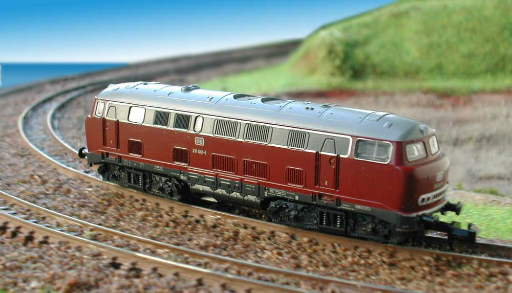 1400-kW-Motorenblock von Daimler und Maybach zum Einsatz. Modell von MinitrixDie runden Formen der Lok sind trefflich wiedergegeben, auch wenn die Gravuren am Gehäuse etwas feiner ausfallen dürften. Sauber bedruckt kommt die rote Lackierung der 70er Jahre leider nicht so gut zur Geltung wie das hell abgesetzte Lüfterband der Erstlackierung. Ein alter 3-poliger Motor treibt die Lok an, entsprechend rollt sie etwas rau an, läuft aber rund. Solides Modell. |